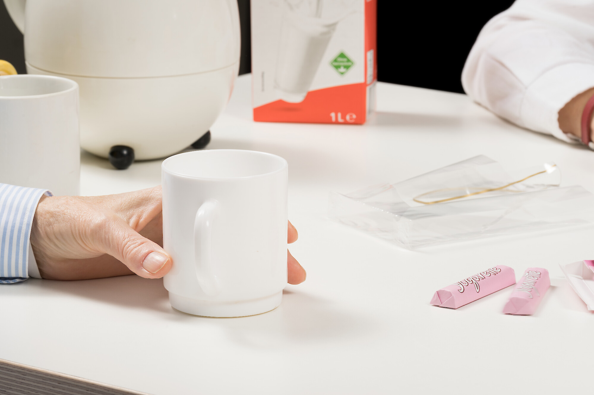 Zwischen Faxgeräten, Rechenmaschinen und Telefonanlagen entfaltet sich das Szenario eines Großraumbüros der 1990er Jahre – jener Schwellenzeit, in der elektronische Datenverarbeitung und Computertechnologien die Ordnung der Dinge nachhaltig veränderten. Inmitten dieses gerade noch analogen Szenarios richten die Bilder den Blick nicht auf Effizienz, sondern auf alltägliche Gesten und Übergangsrituale, in denen die Grenzen zwischen Arbeit und Nicht-Arbeit zunehmend verschwimmen. Zwischen Grünpflanzen und Aktenordnern wird die Kaffeemaschine immer und immer wieder bedient. Hände formen zum Zeitvertreib kleine Objekte aus der Aluminiumverpackung von Süßigkeiten. Die fragmentierten Arrangements umkreisen eine stille Choreografie des Büroalltags, die sich aus Körpern, Dingen und Routinen formiert. Auf diese Weise wird die Atmosphäre eines Ortes erkundet, an dem sich Produktivität und Pause, Funktion und Stillstand in einem endlosen Kreislauf überlagern.
