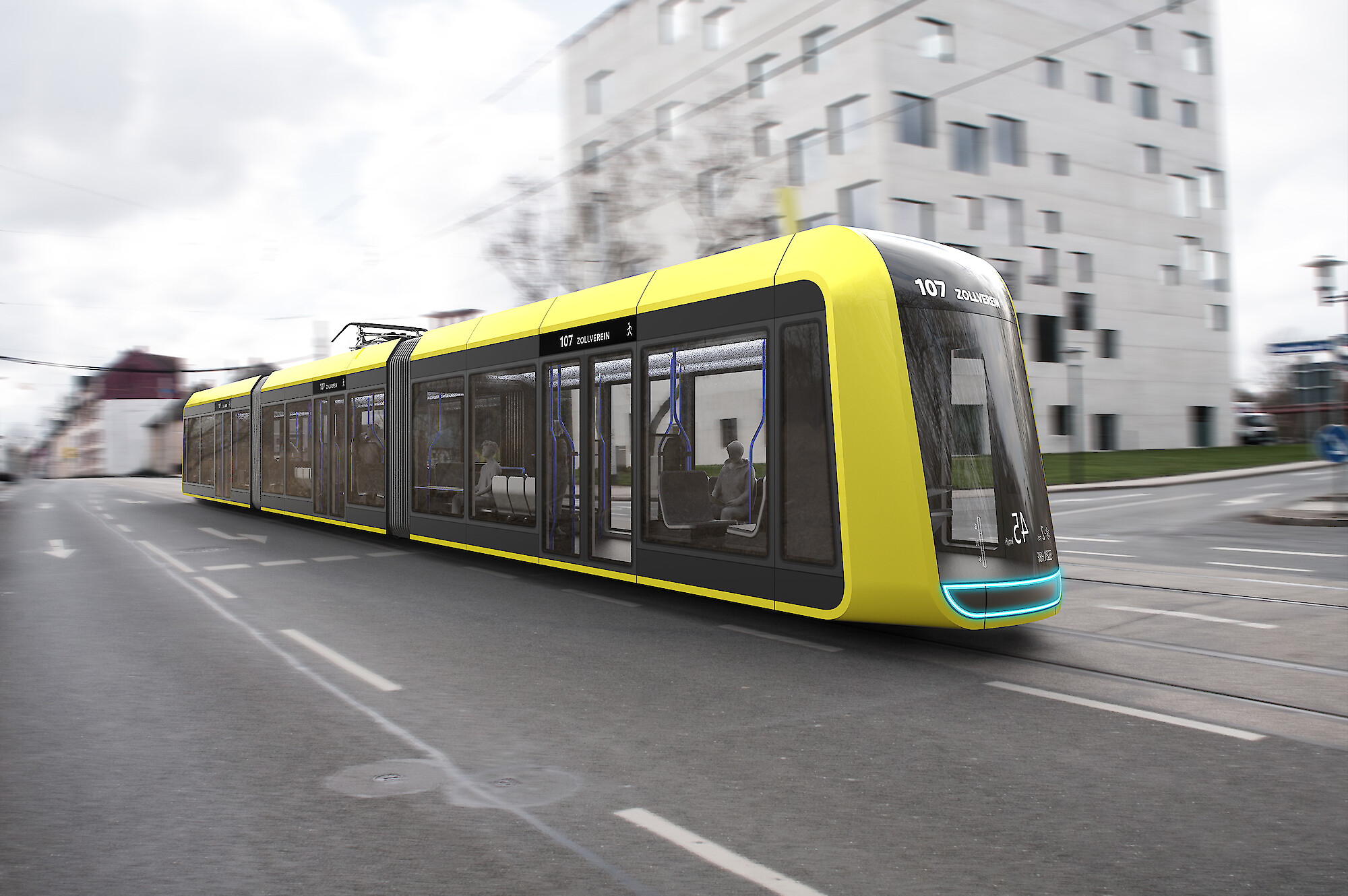 In dem Szenario einer nachhaltigen Stadt ohne private Autos muss die Straßenbahn Funktionen übernehmen, die bisher nur das private Auto leisten konnte. So entstand ein großes Mehrzweckabteil, aber auch Impulse für ein neues, bisher nicht dagewesenen Reiseerlebnis in Straßenbahnen. Durch Augmented Reality-Fenster wird die Fahrt zu einer interaktiven Reise, die die Fahrgäste spielerisch oder informativ zu Orten oder Ereignissen auf ihrer Reiseroute versorgt. Der Arbeitsplatz des Bahnfahrers wird aufgewertet und mit dem Einsatz von neuen Technologien und einer besseren Übersicht, gewinnt der Beruf wieder an Attraktivität.