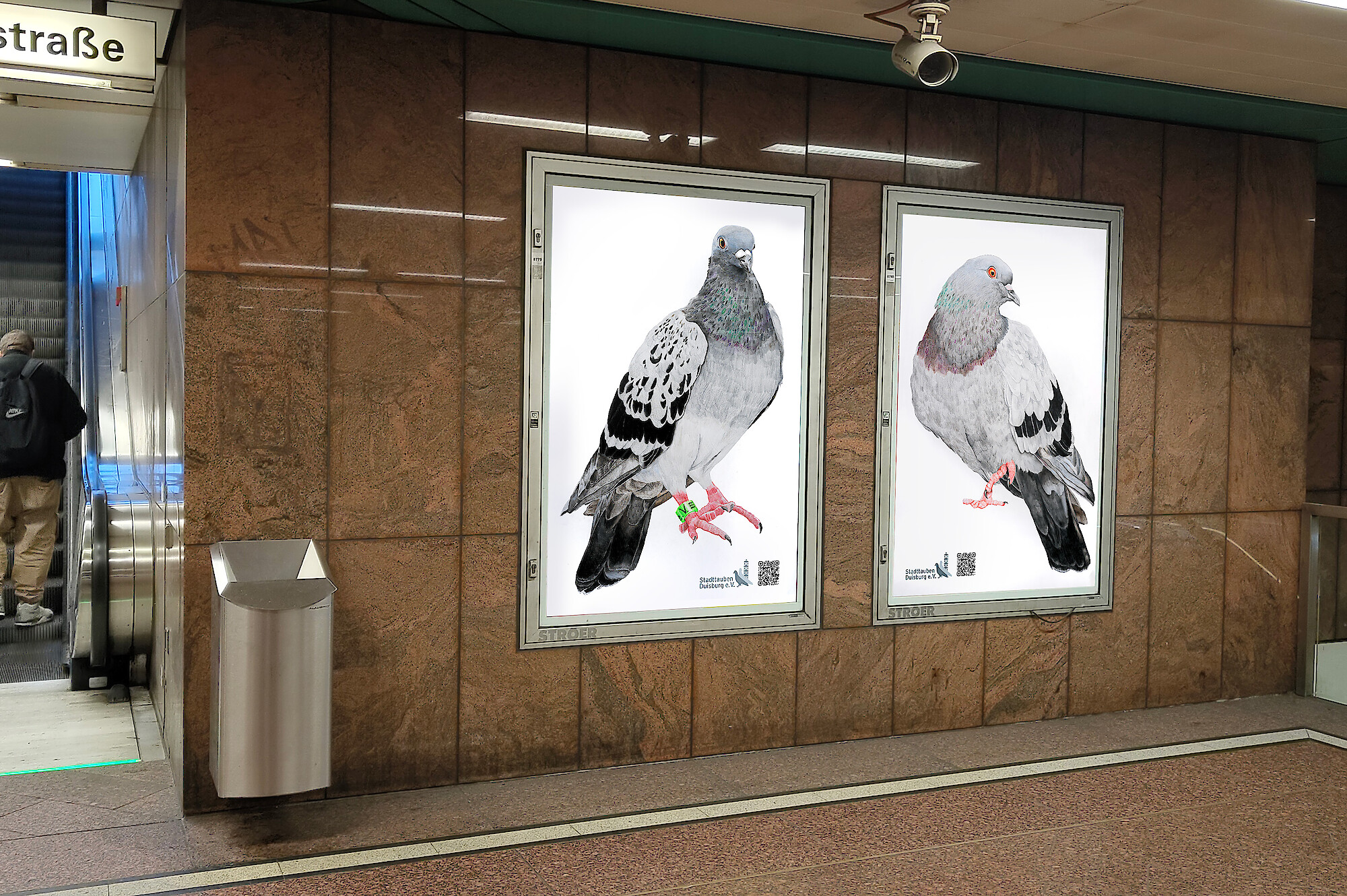 Das empfinden nicht nur viele Menschen als störend, auch für die Vögel selbst sind die Lebensbedingungen eine Katastrophe. Stadttaubenvereine in ganz Deutschland und darüber hinaus versuchen, die Population der Tiere zu kontrollieren und ihnen zu helfen. Eine Kampagne in der Duisburger Innenstadt soll Aufmerksamkeit für die vernachlässigten Tiere erzeugen. Durch aufwendige Zeichnungen soll den Tieren Respekt und Wertschätzung entgegengebracht werden. Mit den großflächigen Plakaten im öffentlichen Raum und einem Set von Stickern sollen Stadttauben die Sichtbarkeit bekommen, die sie brauchen.